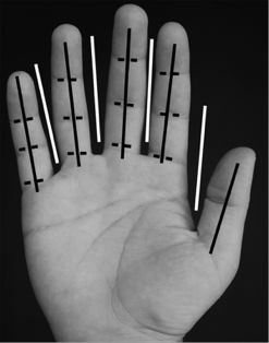 ○ 世界上的大部分数字系统都是以人类手指的数目10为基础的。然而,人类手部的其他特征也可能会影响数字系统的选择。图中白线显示的是手指之间的4个空隙,而黑色虚线显示的是12个指关节,这些手部特征也可以对数字系统起到塑造作用。| 图片来源:作者