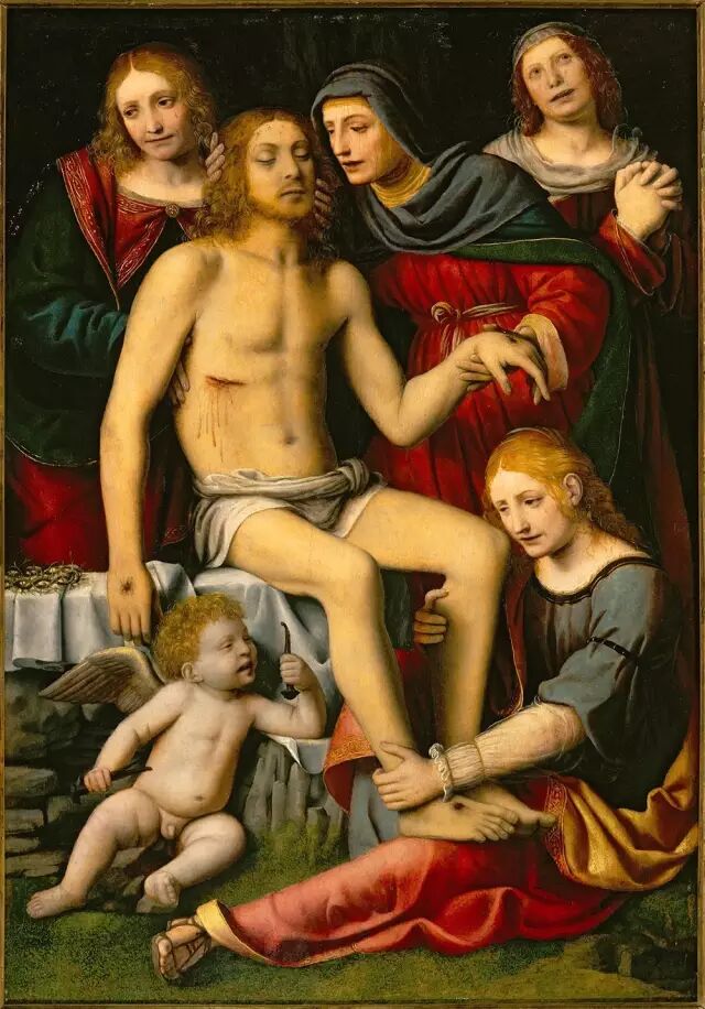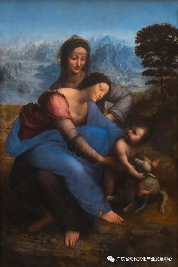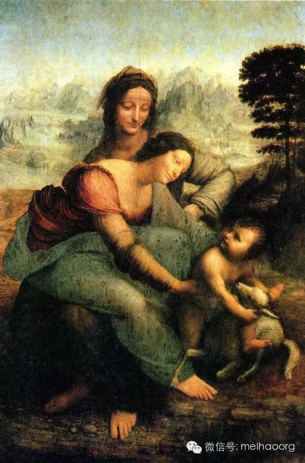 “某些艺术家,像汉斯(Hans Fries)、老赫尔宾(Holbein)和吉罗拉莫(Girolamo dai Libri),他们让安妮坐在玛丽身旁,把孩子放在他们两人之间。另外一些艺术家,像雅各布(Jakob Cornelisz)在柏林的画中画的那样,真正画出了“圣安妮和另外两个人”。换言之,他们把圣安妮画成抱着形象稍小的玛丽,形象更小的救世主坐在玛丽的身上。在列奥纳多的画里,玛丽坐在他母亲的膝头,身体向前倾斜着,两臂伸向男孩,男孩正在玩一只小羊羔,对它似乎有点不和善。外祖母坐着,一只胳膊露在外面,面带着极乐的微笑凝视着另外两个人。当然这个组合是受着某种限制的。虽然这两个女人唇际的微笑与蒙娜丽莎画像上的微笑一样,却没有了离奇和神秘的特性,它所表达的是内在的感情和静谧的幸福。”