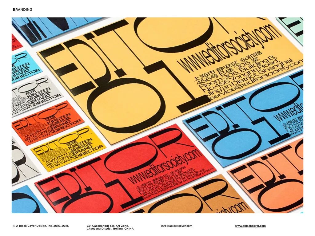 Editor 就是这样一个品牌、传达这样的内容。当你进入 Editor 的商业环境中时,未必感受得到今天周围常见的样态,但它却有着明天可能的视觉展示方式。所以,以往所有的规矩都不成立了,我将习惯的版式、标识规则、字体规则、行距字距都进行了重新想象和归纳。在设计中,没有使用任何常规的版式,只是对于一个版面进行持续地划分:两份、三份、四份、五份,穷尽在这个规则下的各种可能,然后在版面中填满信息,直到完成。未来,它的设计维护成本也非常低,只要有一个懂得基本操作的设计师,就完全能够使用这套 VI 系统了。我没有机会询问东京 TDC 的评审为何会将大奖颁发给我,我猜,是因为他们感受到了来自中国的、汹涌的设计愿望或者能量,就像长着八条大鳌的螃蟹一样,这是由于环境变化,必须做出的一种选择。