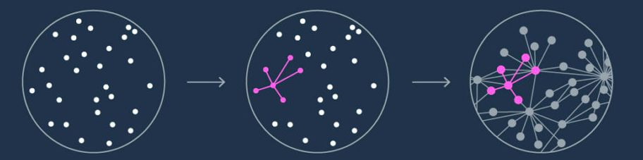 ○ (1)数据集合。(2)将一个子集的几个点连接。(红色)(3)比较子集的图与扩展图的结构能够帮助确定是否可以找到最近邻点,如果新子集的图与扩展图结构相似,那么良好的分区算法将不可能存在。| 图片来源:QuantaMagazine