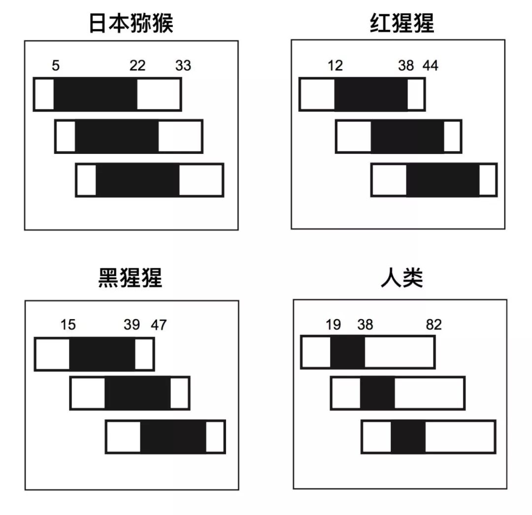 四个物种相邻三代雌性间生育期的重合程度。每个横条代表一代雌性的生命历程,第一代位于最上方,涂黑的部分代表生育期。(来源:Cant et al., 2008)