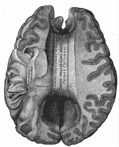 从下方看人脑胼胝体。图的上方对应于脑的前部。图源:维基