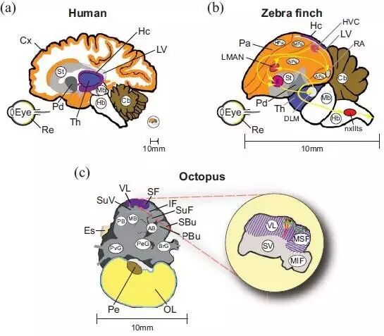 人类(a)、珍珠鸟(b)和章鱼(c)的大脑结构对比图。图源:cephalove.southernfriedscience