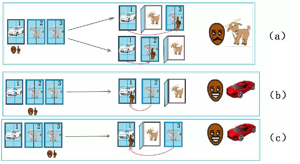 参赛者指定3道门中的一道,有三种可能的情况,每种选择的几率相等(1/3),见图2中的a、b、c: