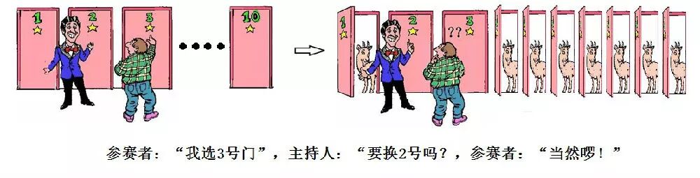 但如果将门的数目增加到10道门(主持人开启8道有“羊”的门,留下1扇),100道门(主持人开启98道有“羊”的门,留下1扇),甚至1000道门(主持人开启998道有“羊”的门,留下1扇)。