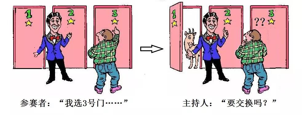 主持人的意思是说:在参赛者选择之后,他打开一扇有山羊的门,留下一扇未开之门,让参赛者决定要不要将原来的选择与剩下的未开之门“交换”?
