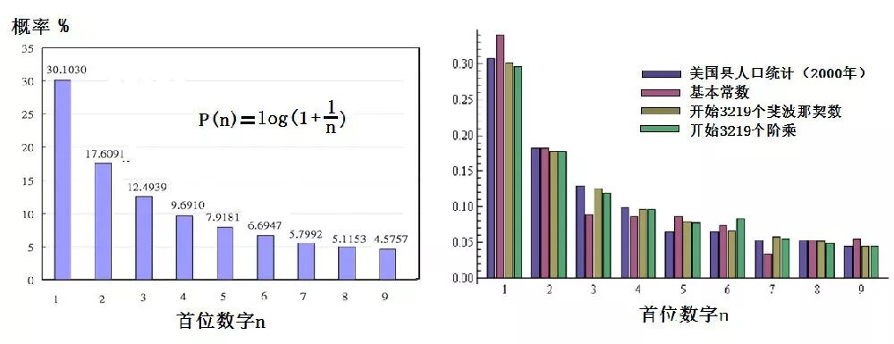 图4右图所示的是符合本福德首位数法则的几个例子:人口统计、基本物理常数、斐波那契数、阶乘。
