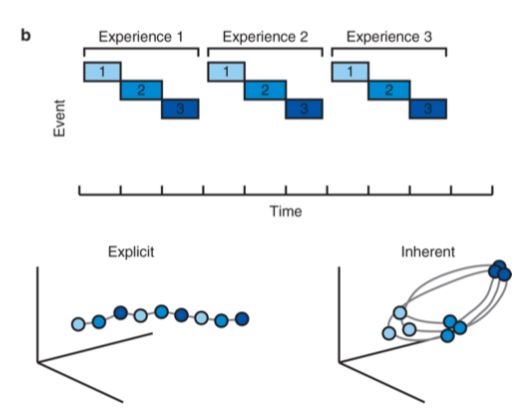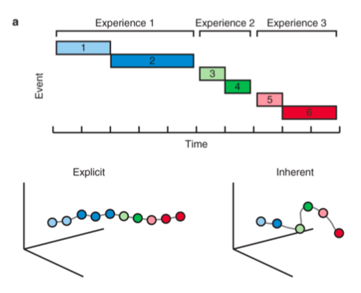 ○  编码时间有两种机制:显性机制(Explicit mechanism)与内在机制(Inherent mechanism)。a图中是一系列体验,每一段体验的持续时间不同,体验内容也不同。显性机制根据相同的时间刻度来表示时间流逝,持续时间相同的两段体验总是有着相同的活动变化,而不论每段体验中的事件数量。内在机制则根据体验到的事件来编码时间信息,即便两段体验的持续时间相同,如果体验的事件数量不同,那么活动变化也将不同。| 图片来源:Albert Tsao et al.