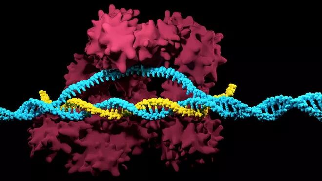 The genome editor CRISPR cuts DNA with help from a guide RNA (green and red) and a Cas9 enzyme (outline) that latches onto a three-base sequence (yellow). KC ROEYER/UNIVERSITY OF CALIFORNIA, BERKELEY