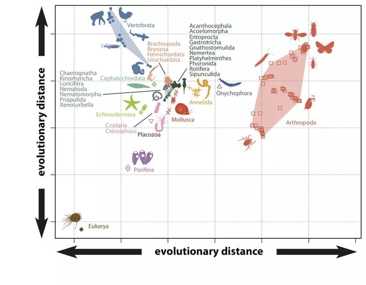 值得一提的是,大多数门类都在动物起源之后不久就达到了它们的差异水平,除了四门例外:节肢动物、脊索动物、软体动物和环节动物的差异水平仍保持了继续扩大,它们有一些成员在进化过程中从水里过渡到了陆地上。迁移到陆地之后的它们面临了新的挑战,使得进化出了新的身体部位。