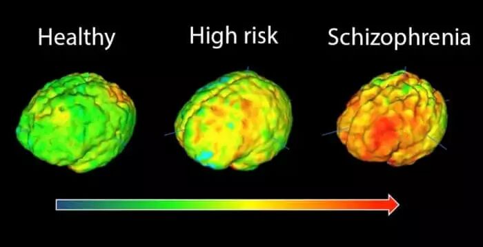 健康志愿者,高风险受试者和精神分裂症患者的正电子发射计算机断层扫描(PET)成像显示,随着疾病严重程度的增加,小胶质细胞(microglia)活性逐渐升高(橙色)。图源:MRC临床科学中心