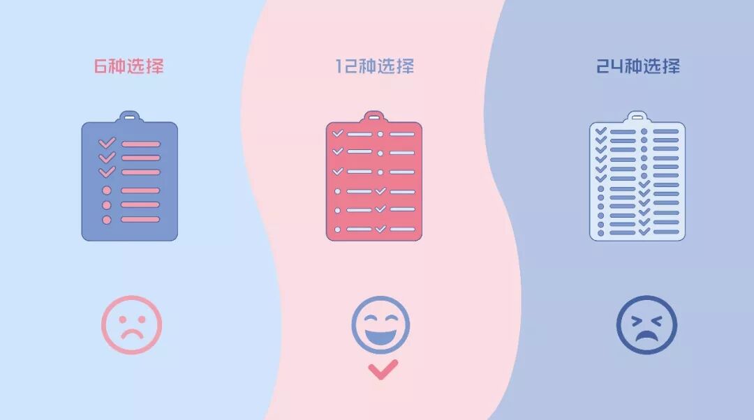 大约20年前在加利福尼亚进行的一项研究证明了这种效应。在这项研究中,研究人员在一家杂货店为顾客提供果酱样品。有时提供24种果酱样品,另一些时候则只有6种。