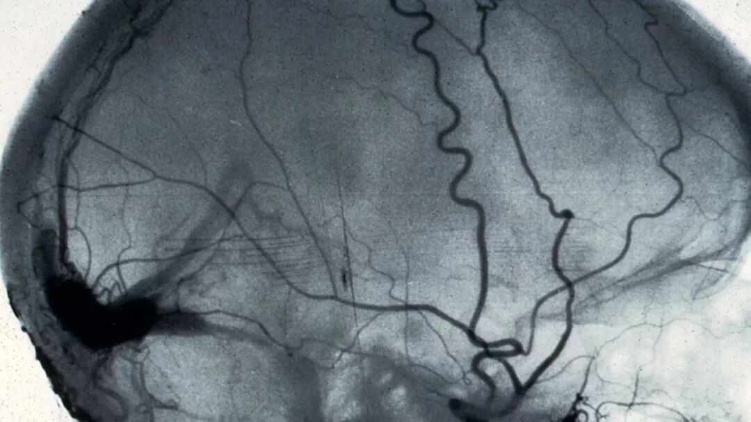 △ 血管造影术(angiogram)拍到的脑部血管。 血管造影术是利用X光观察血管堵塞的医学方法。