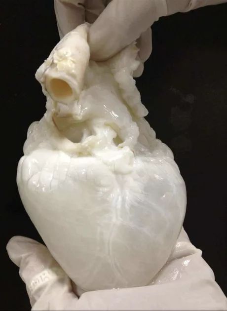 △ 完全去细胞的心脏。这是一个完全去除了细胞的幽灵心脏。德州心脏研究所(Texas Heart Institute) 的研究者用肥皂溶液将一颗猪心的细胞完全去除,只留下了蛋白质结构。这种心脏可以作为干细胞生长的支架,生长新的心脏用于移植。
