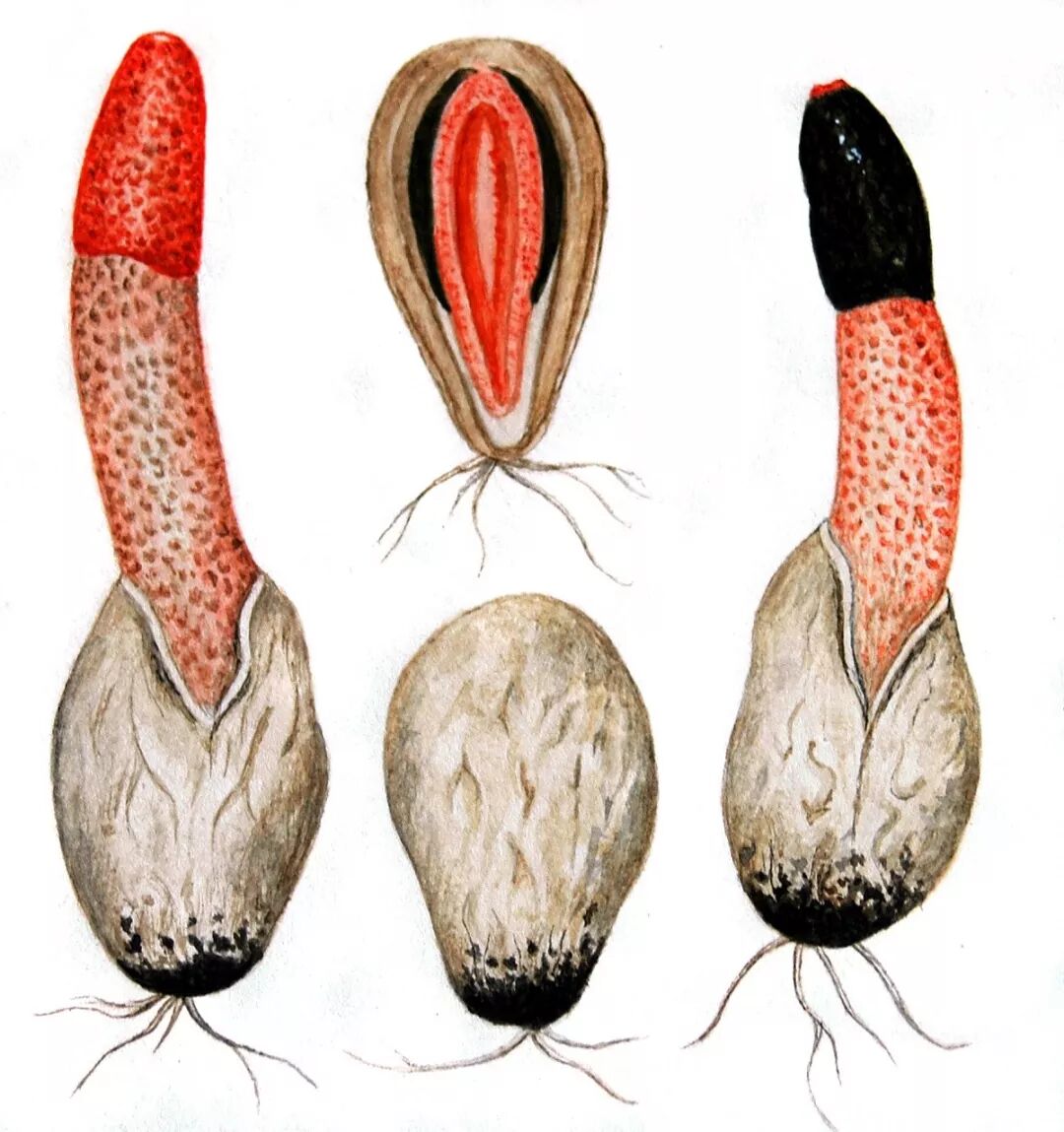 狗蛇头菌(Mutinus caninus),Mutinus是指古罗马生育之神穆提努斯·穆图努斯(Mutinus Mutunus),caninus意为“与狗相似”。它是一种细小的蛇头形林地真菌,“脑袋”呈黑色,上有粘性孢子,据说能够散发出与猫粪类似的气味,用以吸引昆虫。绝大多数人认为狗蛇头菌不可食用,不过,美国西弗吉尼亚等地区的人们还是把它们摆上餐桌。