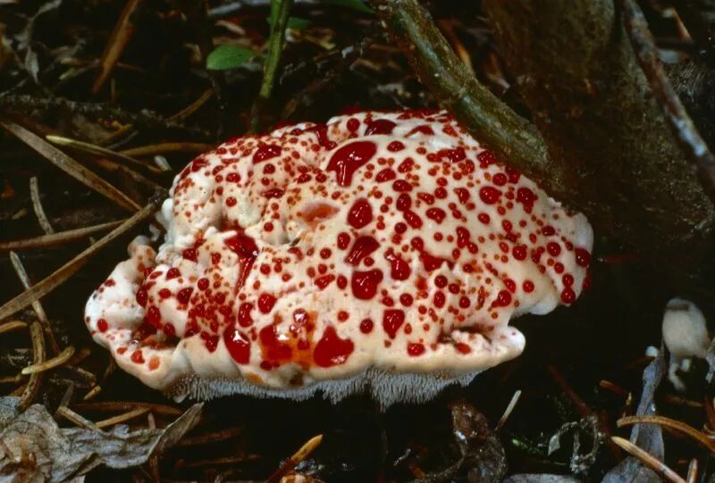 因其“可口”的外表,人们又叫它奶油草莓菌、出血牙菌、红汁牙菌和魔鬼牙菌。潮湿的幼子实体会从气孔中流出鲜红色的液体,其中所含色素具有抗凝血性能。当然,“小时候萌”的铁律同样适用于血齿菌,不过随着它的生长,会逐渐变成不起眼的褐色。