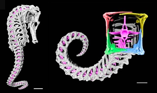 左图:吻海马(Hippocampus reidi)骨骼的显微CT图像,其中品红色标示的是脊椎。右图:海马尾部骨骼的横切面,红黄蓝绿4种颜色标示4个L型骨板。比例尺:左:10mm;右:2mm | Science