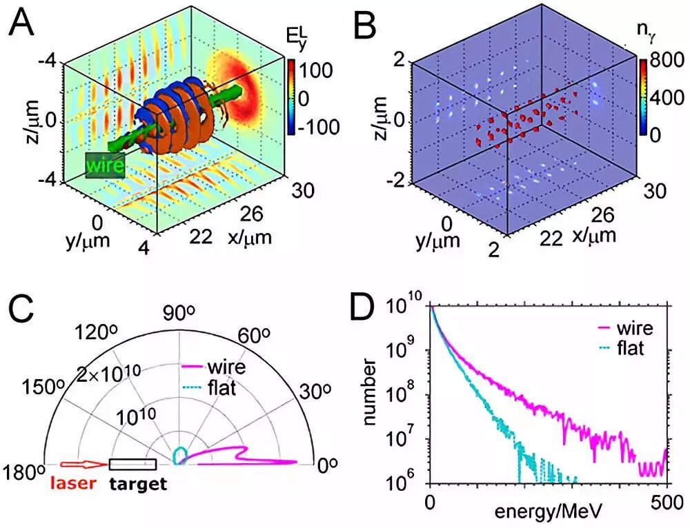 图2. 三维KLAPS粒子模拟结果。 A为激光电场的空间分布(单位mcω/e):激光与细丝靶相互作用时形成了中空的场结构;B为产生的伽玛光子数密度的空间分布(单位为等离子体临界密度nc);C为伽玛光子的角分布:从丝靶中产生的伽玛光子主要沿着靶表面或激光传播方向,而一般的平面靶中产生的伽玛光子的发散角很大;D为伽玛光子能谱。