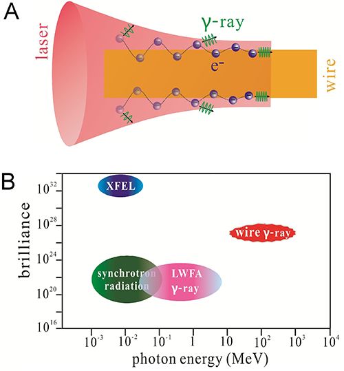 图1. A为丝靶方案的示意图:一束拍瓦激光脉冲沿着亚波长细丝传输时,产生的高能电子束沿着丝靶表面或激光传播方向传输,同时在靶表面产生了很强的静电场和静磁场,此电场力和磁场力相互竞争导致电子束垂直于靶表面振荡,从而辐射出高能伽玛光子;随着激光脉冲逐渐接近其焦平面(此平面与丝靶前端有一定的距离,以充分地引导和加速电子束),电子束能量逐渐增加、其发散角逐渐减小,因此产生的伽玛光子数目和能量逐渐提高、光子发散角逐渐较小。B图给出了大型X射线自由电子激光装置(XFEL),大型的同步辐射装置,基于激光尾场加速器的 betatron 或康普顿散射,以及此丝靶方案中产生的伽玛/X射线光子能量和亮度值。