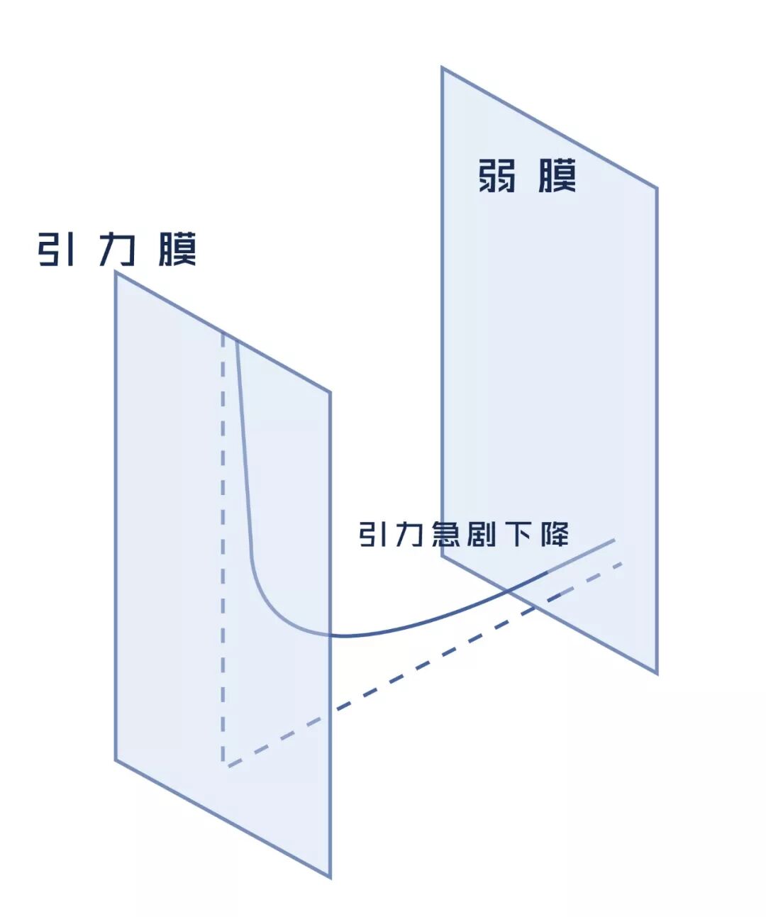 上图中我们看到了在弯曲的时空几何中存在两张膜,其中一张膜上的引力很弱(弱膜),另一张膜上的引力很强(引力膜)。如果我们居住在除引力膜以外的其他地方,引力都会很弱。所有,如果我们居住在弱膜上,那么等级问题就是一件很自然的事情。
