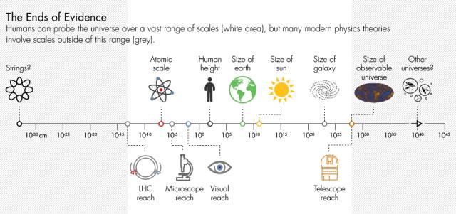 ○人类可以一个宽泛的尺度上(白色区域)探测宇宙,但是现代物理学理论所考虑的许多尺度已经超出这个范围之外(灰色)。| 图片来源:Tynan DeBold/Quanta Magazine