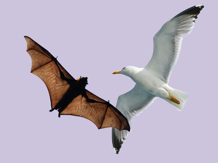 但更深入的研究发现,这三种可飞行的脊椎动物的翅膀是通过不同方式进化而来的。最明显的差别就是空气动力学表面的不同。鸟类利用从皮肤中生长出的羽毛实现与空气的接触。与之相反的是,蝙蝠和翼龙的翼面是由从指骨到身体之间伸展开的紧致皮肤构成的,在有的情况下这种皮肤甚至伸展至了后腿。这三种可飞行生物的翅膀骨架结构也完全不同。