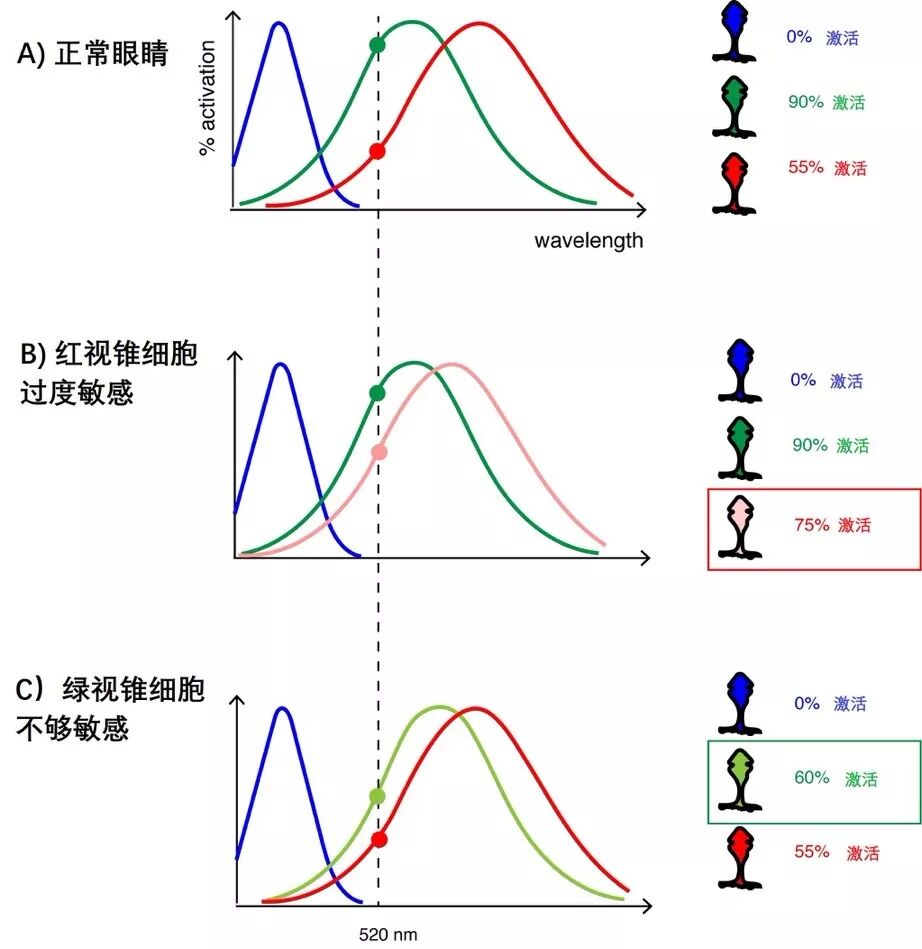 色弱患者的视锥细胞会激活不足或过分激活,让大脑难以判断眼镜看到的颜色(图片来源:SITN 有修改)