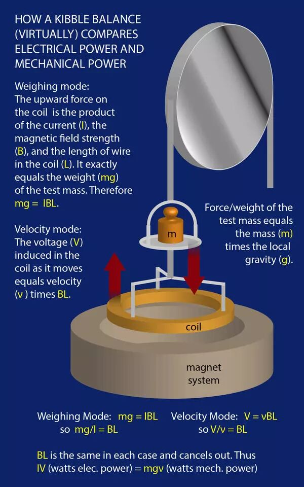 将待称量物体放在线圈上方的秤盘中,产生向下的重力(mg)。然后,在基布尔秤的称量模式,让电流通过线圈,直到电流和磁体相互作用产生的向上的力恰好平衡向下的重力,系统达到平衡,记录此时的电流。这个力的计算非常简单,就是19世纪人们已经知道的安培定律F = IBL(I是电流,B是磁感应强度,L是线圈长度)。但问题是要精确的测量BL异常困难,而这需要下一步“速度模式”的进一步测量。