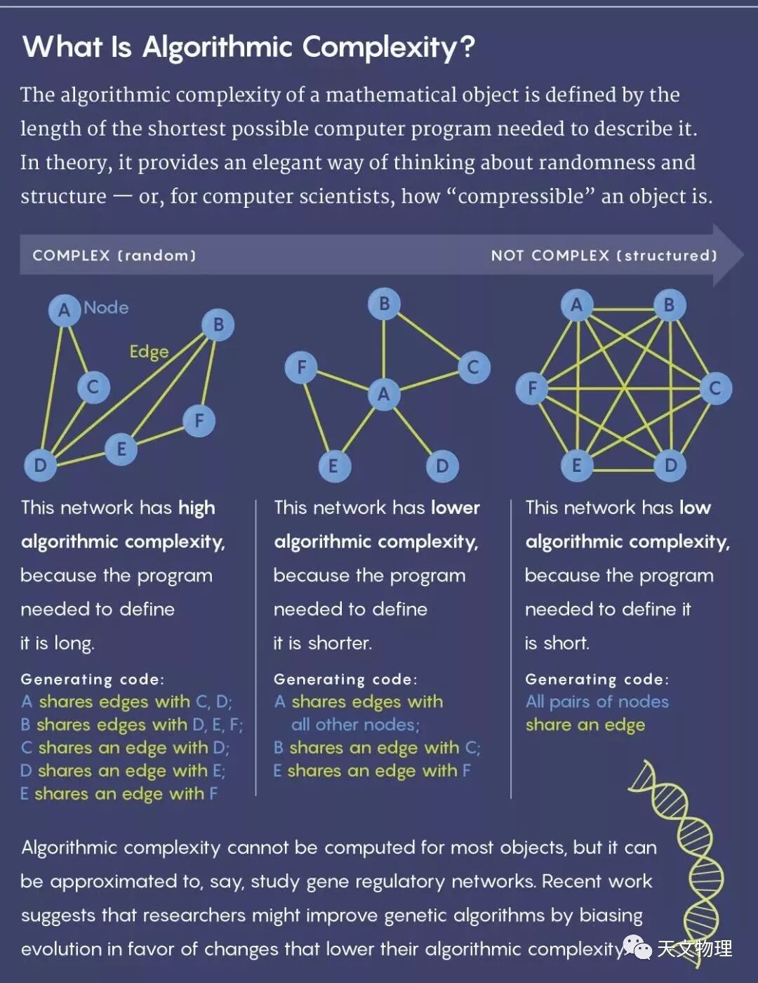 如果它们推动网络变得更加简单,则会出现更少但更稳定的功能。但是Kolmogorov复杂性是否能作为一种工具之外的东西——作为蔡廷认为的变革驱动力还有待观察。尽管算法信息的确存在问题,但它在生物学领域确实有一些吸引力。传统上,用来描述进化动力学的数学框架是种群遗传学,但是群体遗传学也有其局限性;例如,它不能解释生命的起源和其他主要的生物转变,也不能解释全新基因的出现。一个在数学理论中迷失的概念是生物创造力的体现,如果我们把算法信息考虑进去,创造力就会自然而然地融入其中。进化过程本身会随着时间的推移而改善并变得更有效率的观点也是如此。
