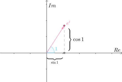 对应的是单位圆上幅角为1的点,所以先给个参照物,虚线是单位圆,实线对应的幅角为1: