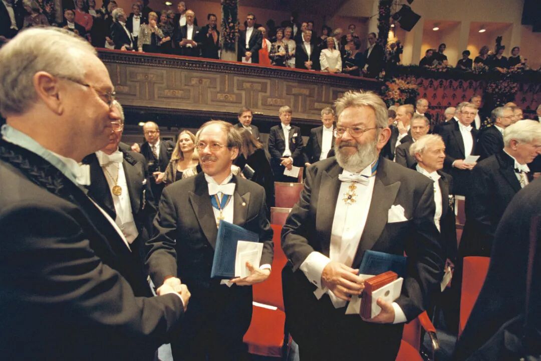 特•胡夫特(左)和韦尔特曼(右)在诺奖颁奖典礼(图源:naukas.co)