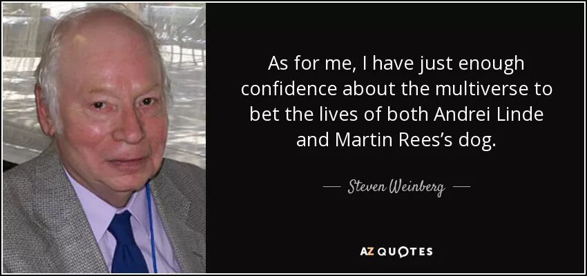 不同的物理学家对人择原理和多重宇宙有不同的看法。阿兰•古斯曾经总结过几位物理学家的看法。英国物理学家马丁•里斯(Martin Rees)说,他十分确信多重宇宙是存在的,他愿意用自己宠物狗的性命打赌。美国斯坦福大学的安德烈•林德(Andrei Linde)说,他也足够确信这一点,愿意用自己的生命打赌。然后温伯格表达了自己的看法:我也足够确信,我愿意用里斯的宠物狗和林德的性命加在一起打赌。