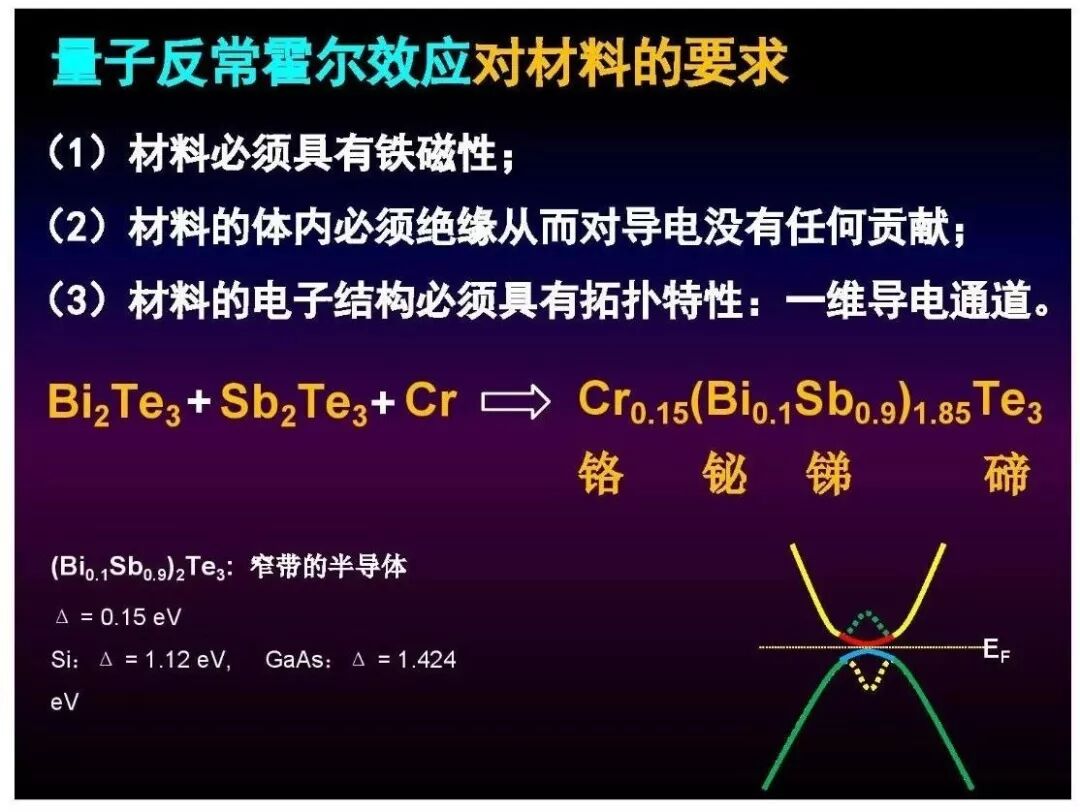 量子反常霍尔效应对材料性质的要求非常苛刻,如同要求一个人同时具有短跑运动员速度、篮球运动员高度和体操运动员灵巧:材料能带结构必须具有拓扑特性从而具有导电的一维边缘态;材料必须具有长程铁磁序从而存在反常霍尔效应;材料体内必须为绝缘态从而只有一维边缘态参与导电。在实际材料中实现以上任何一点都具有相当大的难度,而要同时满足这三点对实验物理学家来讲更是巨大挑战,正因为此,美国、德国、日本等科学家未取得最后成功。