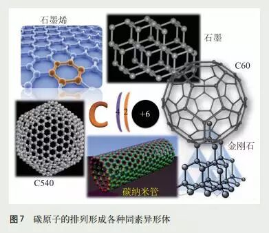 可不要小瞧这微观世界的八卦阵,它厉害着呢!不同的原子排列方式不仅决定了材料的外形,而且决定了材料的许多基本物理性质。举个最常见的例子,一颗璀璨的钻石和一支写字的铅笔芯有什么异同?它们都是碳原子组成的!谁说朽木不可雕?朽木可以变成木炭或铅笔,也可以变成钻石!区别在于,铅笔芯里主要是石墨,由一层层的六角排列碳原子构成,所以碳原子特容易剥落,可以轻易留下字迹;但是钻石内部是由碳原子密堆起来的,碳原子间存在非常稳定的结构,形成了自然界硬度最高的材料——金刚石。碳原子的不同排布就如同孙悟空的七十二变一样,除了石墨和金刚石,还可以有单原子层的石墨烯,卷成管子的碳纳米管,60个碳原子组成的足球烯等等(图7)。这些材料性质千差万别,又同宗同源,我们称之为“同素异形体”。也不要太恐慌,微观世界的八卦阵型其实并不是想象中的那么多。数学家告诉我们,微观八卦阵(空间群)最多也就是230种,这230种又可以划分为7大类和14小类[5]。不要问我为什么,反正,世界,就是如此简洁!