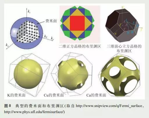指出以上两条“兵法”的,是两位“布家”的物理学家——布洛赫和布里渊。莫激动,他们不是兄弟俩,也不是邻居。话说回来,划分14小类的原子阵法,也叫做14种布拉伐格子,真是“布衣出英雄”啊!言归正传,根据“布家兵法”,我们可以把材料内部近自由电子们按照能量和动量分布给排列起来。电子们只能在某些特定的能量和动量区间内出现,形成一条条“电子带”,又叫做“能带”,这就是它们的破阵大法了。最高能量的电子,也就是跑的最快的那些家伙们,按照动量的空间分布,构成了一个包络面,又叫做“费米面”,这就是它们的先锋队了。不同材料的费米面是千奇百怪的,如钾的费米面是一个闭合的球面,但铜和钙的费米面就会有或大或小的洞洞(图8)[6]。由于空间上周期重复的阵法,某个特定区域内的破阵小分队就足以代表整个大部队,超出此区域的别人家的孩子也等价于自己家的孩子,这个区域叫做第一布里渊区,简称布里渊区。一个三维的立方原子阵法,其布里渊区是一个削掉角的正八面体(图8)[7]。嗯,此处有点烧脑。还好,本质还是八卦阵的破阵秘诀,电子在材料内部的动量和能量分布也是有一定对称规律的!当然,事实上,材料内部的电子部队结构还是非常复杂的,这就是宏观材料出现各种的电磁热等物理性质的原因(图9)。要理解材料的宏观物性,一是要破解原子八卦阵法,二是要掌握电子破阵兵法,二者缺一不可。