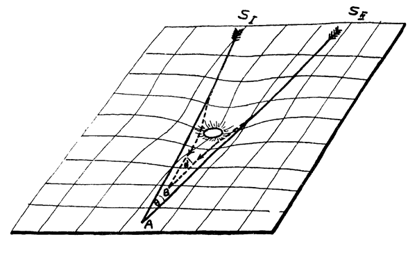 这样一来,作为一种独立的力的重力概念就从我们的思想中彻底消失了。取而代之的则是纯粹的空间几何学概念,在这个空间中,所有物体都按照其他大质量所造成的弯曲沿着“最直的线”或测地线运动。