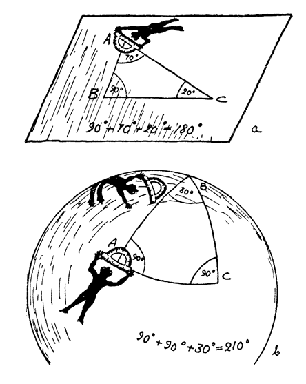 图39 “平面世界”和“曲面世界”上的二维科学家们正在检查关于三角形内角和的欧几里得定理。