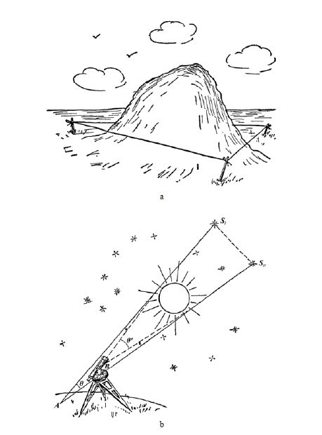 如果能用其他某个大得多的星体来代替太阳,关于三角形内角和的欧几里得定理就会出现若干分甚至若干度的误差。