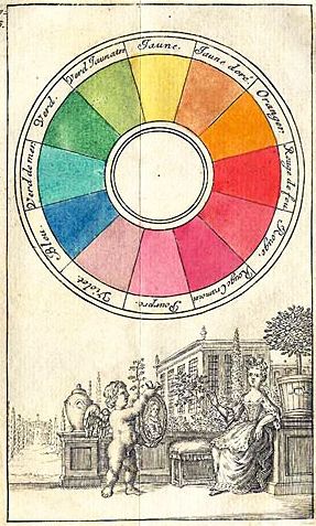 与RGB一样,减色混合的三原色是红、黄、蓝,简称RYB,构成了标准画家色轮中的三原色。在18世纪,RYB原色成为色彩视觉理论的基础。这些理论在18世纪通过对各种纯粹的心理色彩效果的研究得到了加强 [7]。