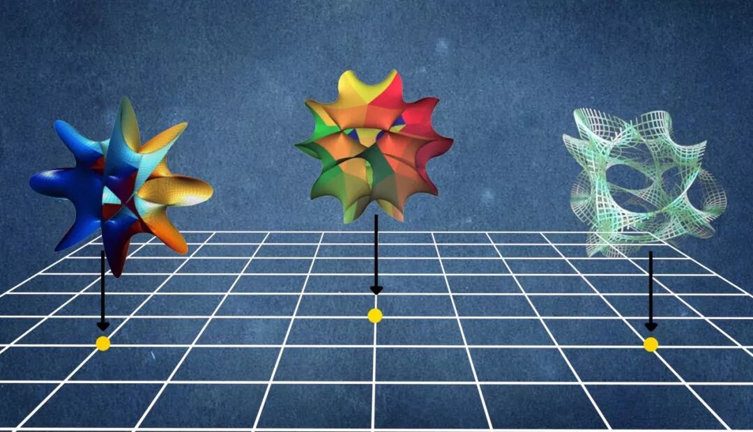 在弦理论中,位于空间每个点的形状不是圆或球,而是一个具有六个额外维度的形状。