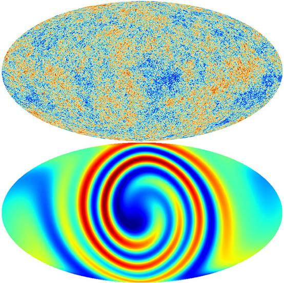 For example, space could be expanding at different speeds along different axes. Such differential expansion would cause the radiation from some directions to stretch to longer wavelengths than in others, and the upshot would be a big bull's-eye pattern in the CMB. Or, space could be rotating about a particular axis, which would create a spiral pattern in the CMB. Finally, the newborn universe could have been agitated by distortions in space itself known as gravitational waves, which would stretch the whole cosmos in one direction and compress it in a perpendicular direction. That sort of motion would leave more complex spirals in the CMB. In all, the researchers identify five potential patterns or "modes" in the CMB that would signal some sort of special direction in space.
