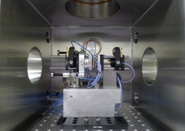 ○ 在实验中,两层膜(位于中间的铜板上)被置于一个真空室中,它们的温度和位置被精确控制。| 图片来源:XIANG ZHANG/UNIV. OF CALIFORNIA, BERKELEY