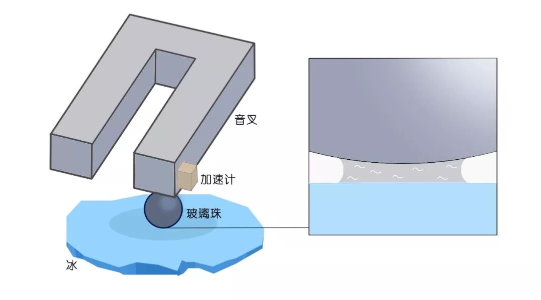 在设计这套力仪器时,他们借助了一个类似于音叉的实验装置,并在音叉上连接了毫米大小的玻璃珠,玻璃珠会像一个小的冰刀一样,以几十微米的距离尺度在同一区域的冰面上滑行。音叉是用来振动的,在音叉上还附有一个加速计,用于测量玻璃珠在水平和垂直方向上的振荡振幅,从而计算出玻璃珠和冰之间的摩擦系数。