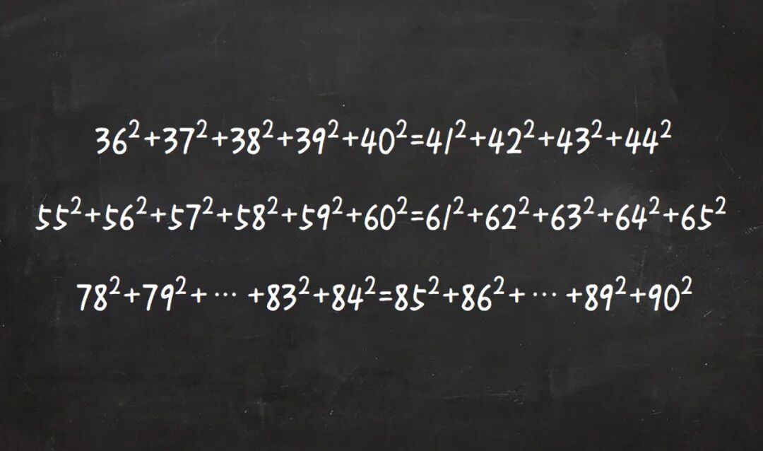 事实上,它们是唯一满足等式a² + b² = c²的连续整数。但是,如果你允许在这个等式囊括更多数字,或许就可以有其它连续整数能满足更复杂的等式,比如a² + b² + c² = d² + e²。而有意思的是,这个等式也只有一个连续整数组解:10² + 11² + 12² = 13² + 14²。