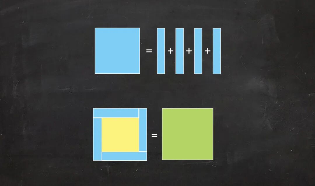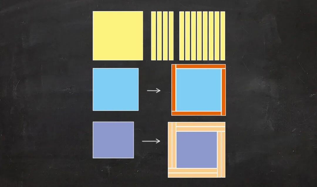 就像上次一样,为了完成第一个正方形,我们总共需要4个宽度为1的细长条;但要实现第二个正方形,就还需要4条宽度为2的细长条。