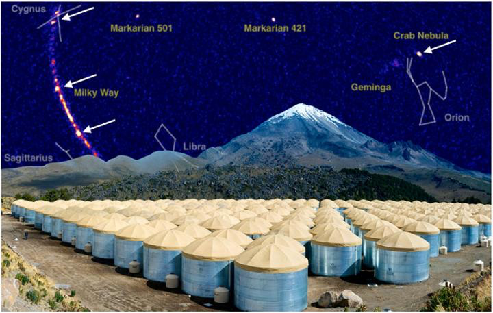 ○ 由300个水箱构成的高海拔切伦科夫(HAWC)天文台。图片中的箭头表示的是银河系内的四个能量超过100TeV的伽马射线源。| 图片来源:HAWC