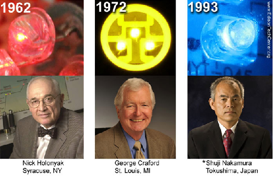 随着半导体的发现,人们发现一个简单的方法,就是用两种不同类型的半导体,比如P型半导体或者N型半导体,两个接到一起,通过电就可以产生发光,我们通常称这种器件为发光二极管,然后把它封装到这样一个小的塑料壳里面,就可以形成发光二极管。大家可以看到不同色彩的发光二极管,其实发光二极管的发现并不是那么容易。最早实现发光二极管的时候,看到的是红色二极管,大约是1962年,但是当人们发现黄色二极管的时候,已经是10年以后了,1972年。后来因为蓝色发光二极管的发现,才让人们觉得发光二极管更加地可实用化。而蓝色的发光二极管的发现却让科学家们花了21年的时间。同时日本的物理学家中村修二,因为发现蓝色的发光二极管和激光二极管,在2014年获得了诺贝尔物理学奖。因为有了三种颜色的发现,就能拼成全色,所以二极管在显示有很大的应用,我们看到不同颜色的显示,有了这三种颜色 我们就能真正达到全色显示。