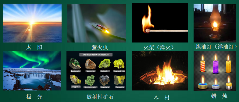 首先讲光的发射。光的发射对人来说,最直接的光发射就是太阳,我们能观察到自然界中的光发射就是太阳。同时在南极和北极,由于正负电的电荷在地磁场的作用下有可能在南极和北极形成极光,这也是在自然界中可以观察的发光的现象。而离大家比较近的就是动物界的萤火虫,它可以主动发光,这是由生物发光引起的。还可以观察到的一些发光现象是一些放射性的矿石,它主要是由于放射性的元素导致的发光现象。而人们更希望的是能够主动发光和照明,那么最早期采取的办法就是钻木取火,这个时候你会看到,我们使用木材来发光,后来才逐渐地利用小的发光点,比如说火柴或者是煤油,以前还叫洋火或者洋油。而实现发光最简单的原理是什么呢?