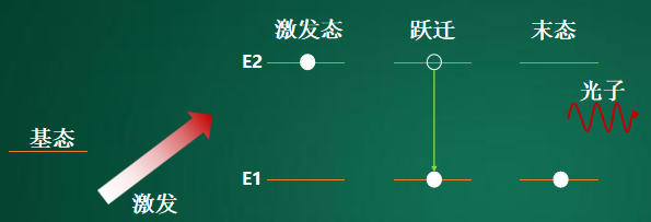 我们希望从这样简单二能级体系里面,从基态比如说E1 激发态是E2,如果原子在激发态的时候,它跃迁到基态,能量从高往下掉的过程中就会产生一个光子,那么这时候就称它为发光。要实现这样一个激发态,最简单的事情是,通常的原子在普通状态时都处于基态,而要从基态到激发态这一过程需要激发。而在过去这么多年里面,人们都采取各种各样的方法激发原子从基态到激发态实现发光,比如说太阳就是通过核聚变产生的热,形成的黑体辐射,实现的发光。还有一些矿石可以通过热发光,比如它本来不发光,在一定的温度下可以看到它发光的现象。还有萤火虫等生物发光等等。还有一些声致发光或者是阴极射线打在物体上导致的发光,我们就不具体说了。有一个现象是光致发光,也就是说我先用一束光激发在物体上,然后再把它激发到激发态的时候,它可以从激发态跃迁到基态形成一个光子,我们称之为光致发光,这个跟我们后面的光吸收还有关系,我后面还会继续说。