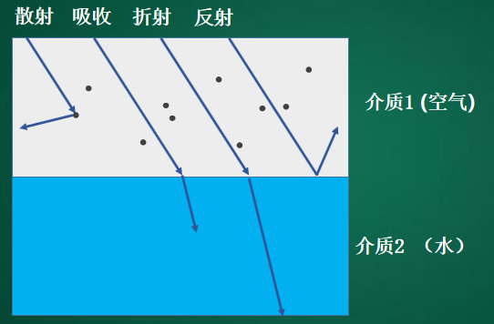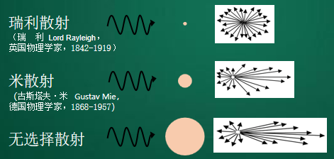 当一束光打到一个粒子上的时候,会有向不同方向发生散射,同时散射还跟光的波长或者跟光的能量有关。刚才我提到不同的波长,比如红光能量比较低,蓝光能量比较高。而我们又将散射分成不同的类型,比如说一个光的波长跟散射粒子尺寸它们之间比较的时候,如果散射粒子尺寸远小于光的波长,这时候称这种散射为瑞利散射,那瑞利散射的过程中,对不同波长的光有不同的散射效果,比如说蓝色的光更容易受到散射。如果你的粒子尺寸跟波长差不多或者相比拟的时候,我们称这种散射为米散射,米散射通常都是一些大的颗粒或者是水蒸气。还有一种颗粒更大的时候,也是一种米散射,但这时候对光就没有选择性了,所以我们称之为无选择性的散射。